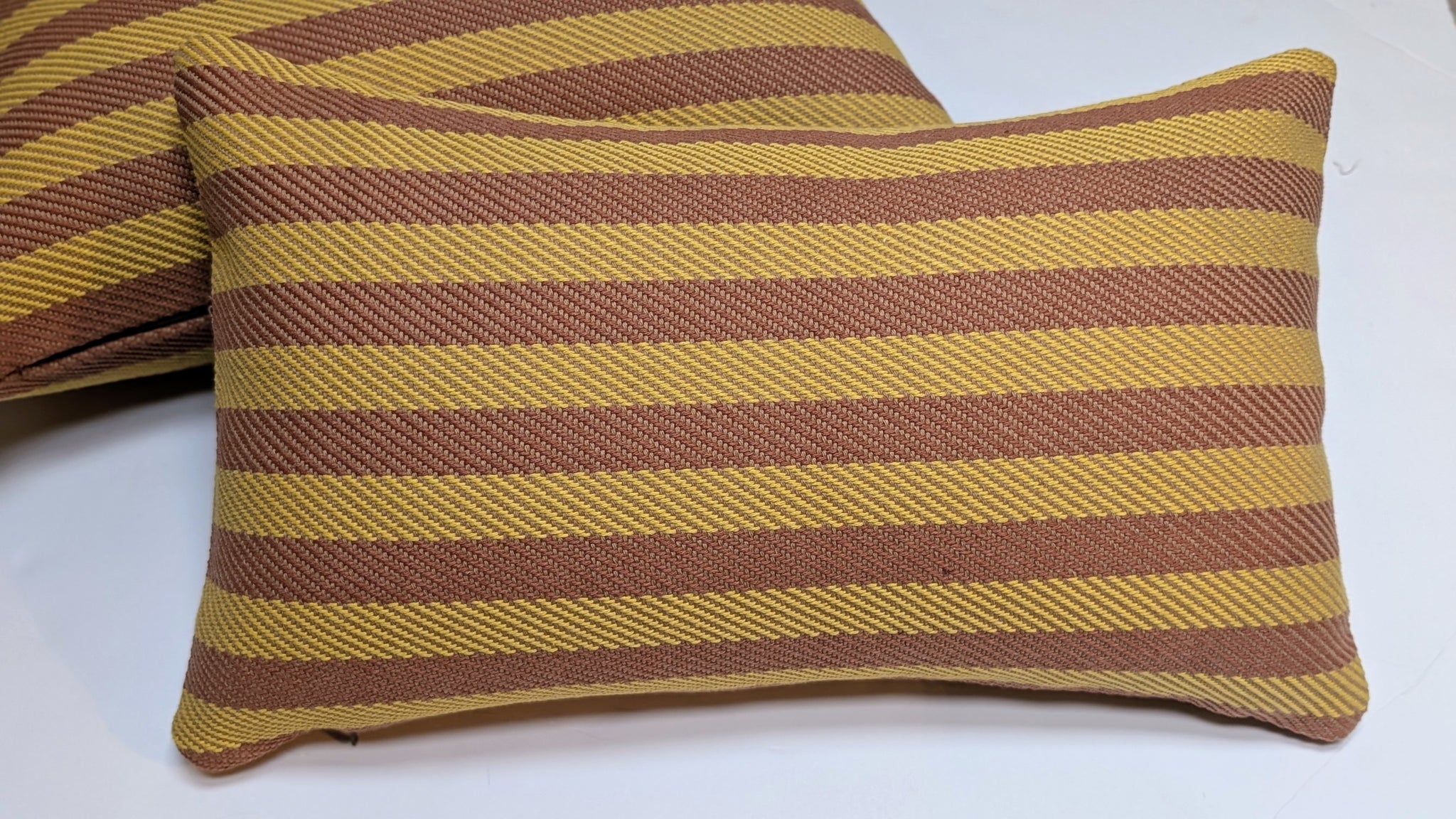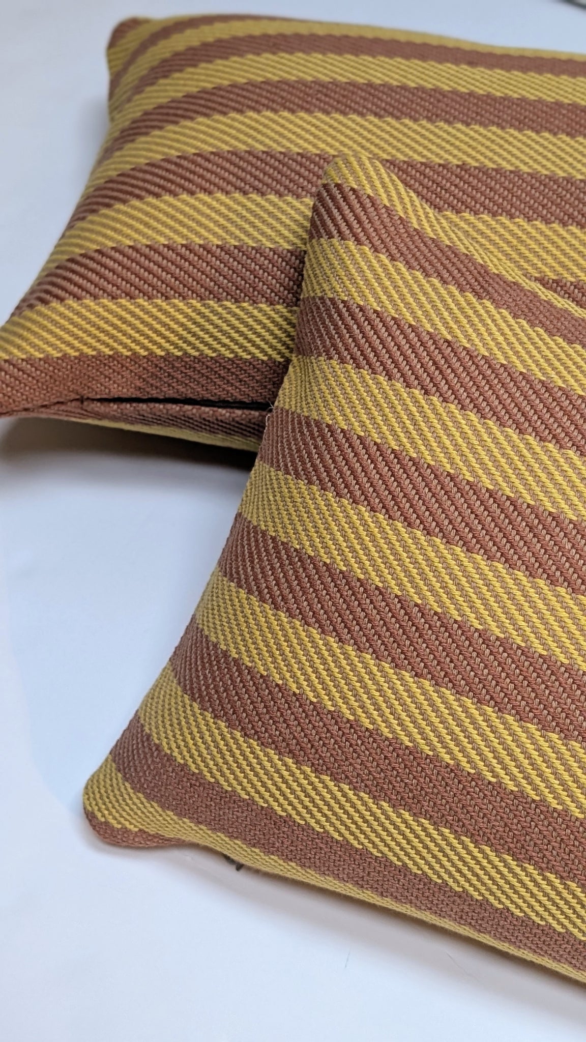 Two striped cushions, one brown and yellow, the other yellow and brown, on a white background.