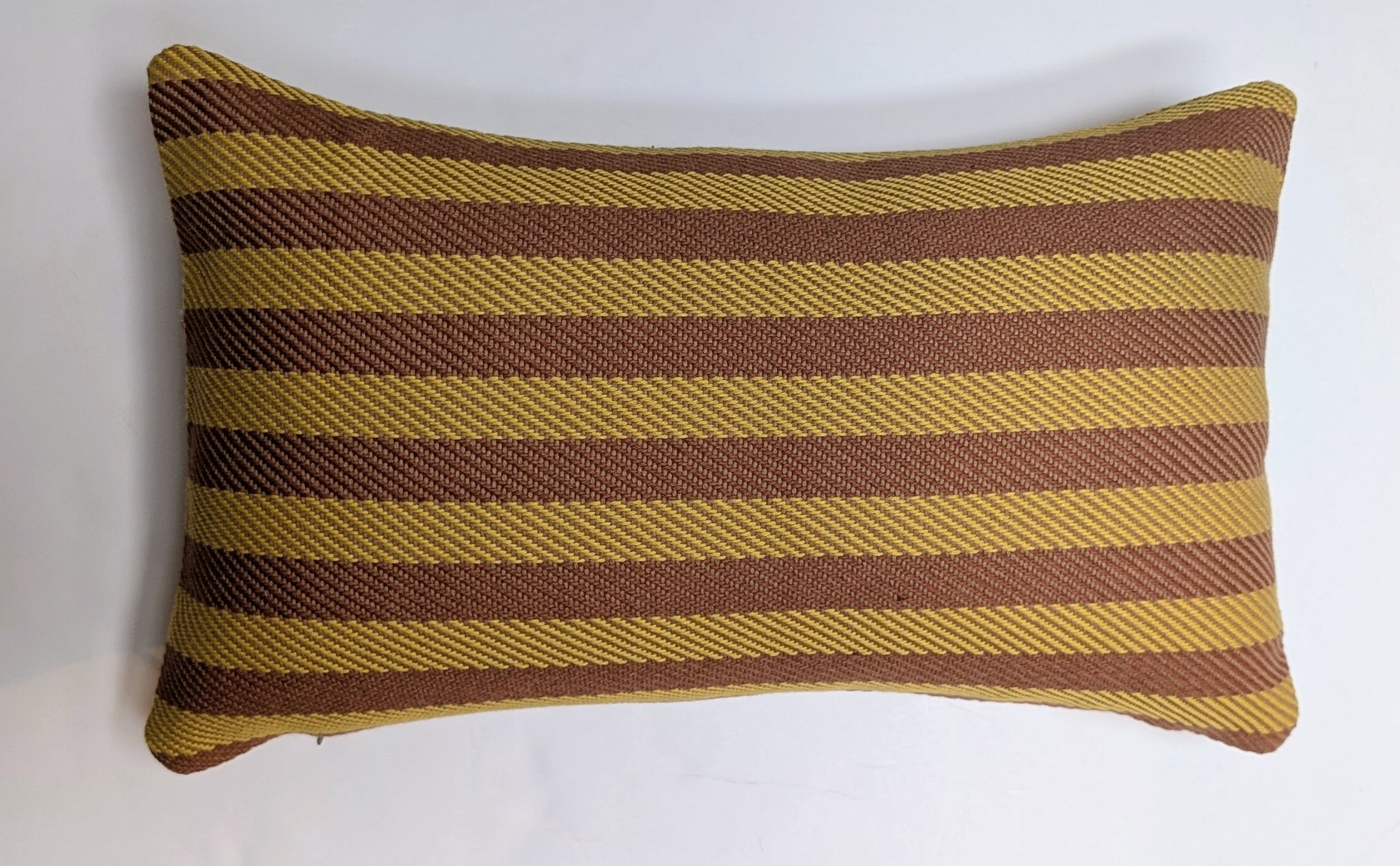Striped pillow with brown and yellow horizontal stripes on a white background