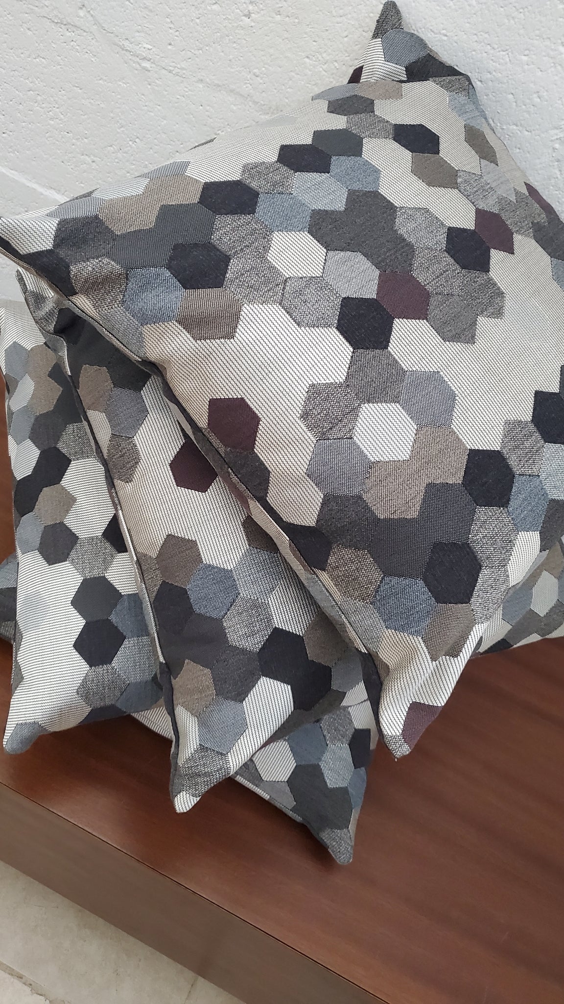 Maxwell Street 12 is an innovative take on the traditional tapestry technique, it features Clusters of hexagons in beautiful color combinations contrast with silvery background, creating layouts that are organic and geometric at the same time.  gray and silver colors.